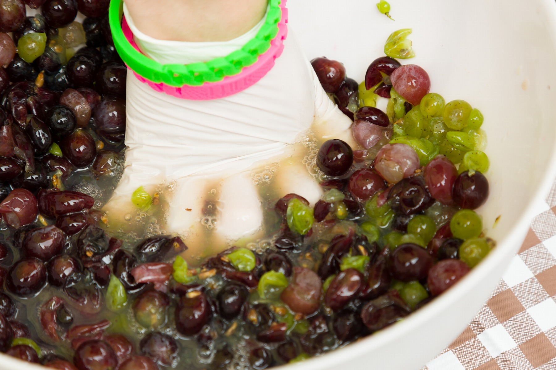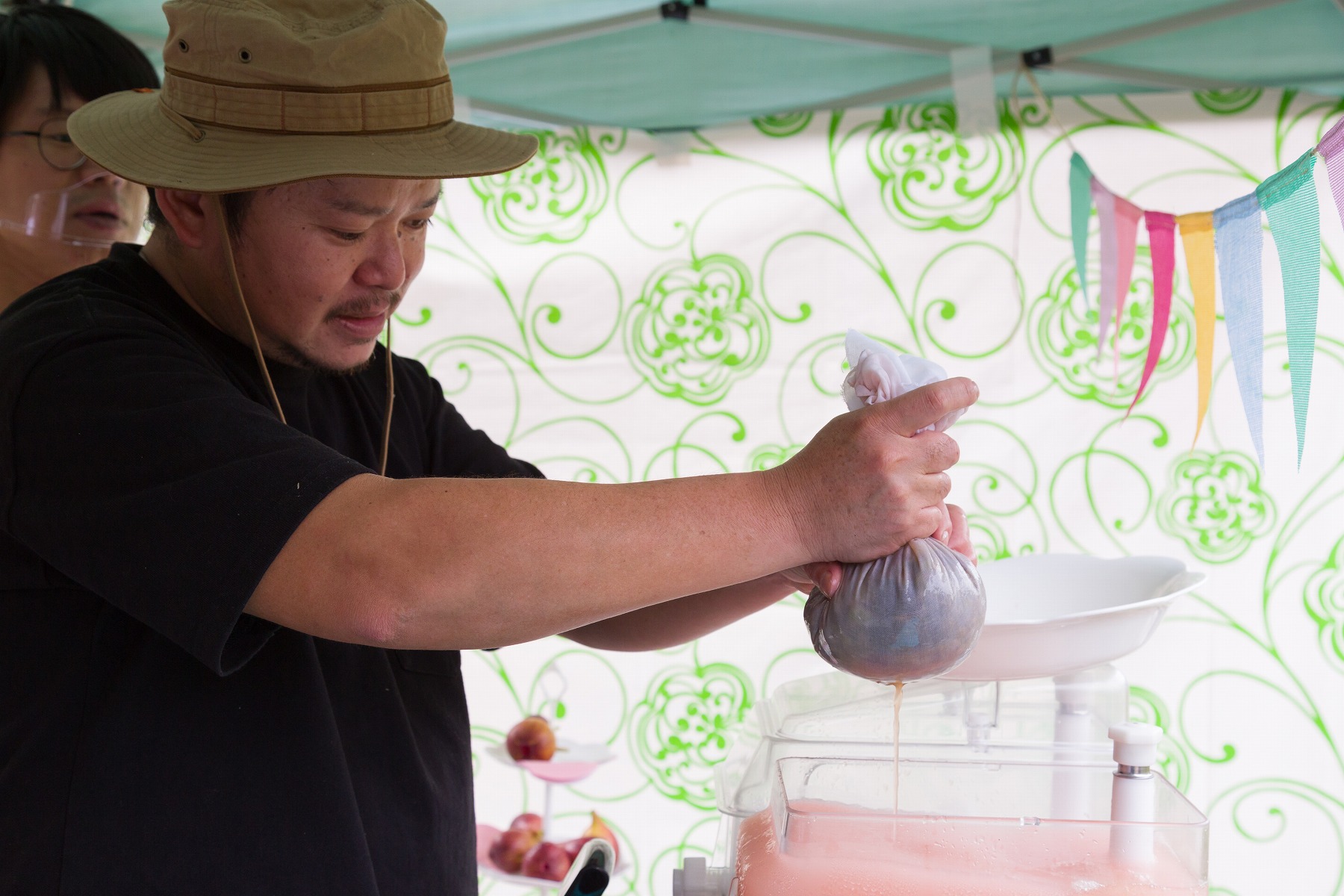また、収穫したぶどうをワインに醸造する過程を聞いたり、収穫したぶどうを使った「フロゼ(フローズン・ロゼ)」づくりを実施。